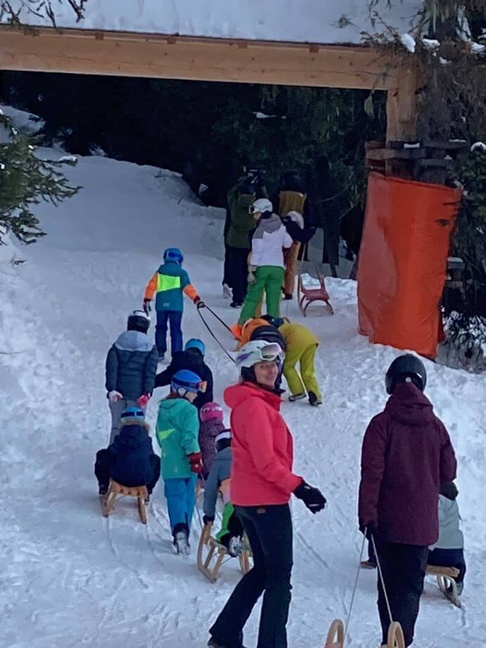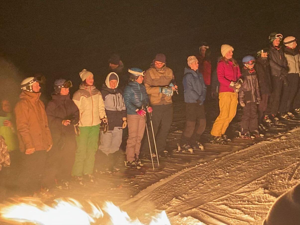 Das neue Jahr begrüßen wir traditionell an unserer selbstgebauten Schneebar, nachdem die ganz Mutigen nach der Fackelabfahrt noch übers Feuer gesprungen sind (wer traut sich diesmal?).