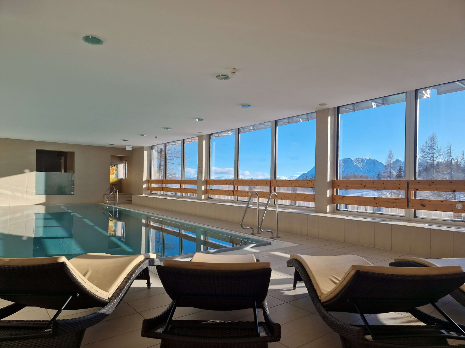 Als besonderes Highlight dieses Jahr ist unsere Unterkunft mitten im Skigebiet – Ski-in und Ski-out inklusive. Wir wohnen also direkt im Skigebiet an der Piste im frisch im Sommer 2025 renovierten Jugendgästehaus Tauplitzalm auf 1650m inklusive Wellnessbereich mit Sauna und Hallenbad mit Blick auf die verschneiten Berge.